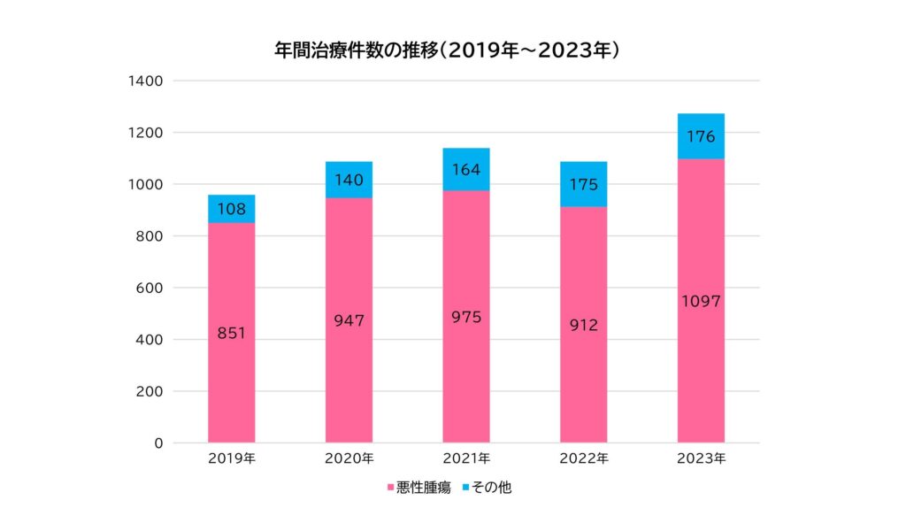当院の外来化学療法室は、平成20年に開設され、現在8床(ベッド3床、リクライニングチェア5床)で稼働しています。外来化学療法室で実施される薬物療法は、年間約1200件を超えており、年々増加傾向にあります。