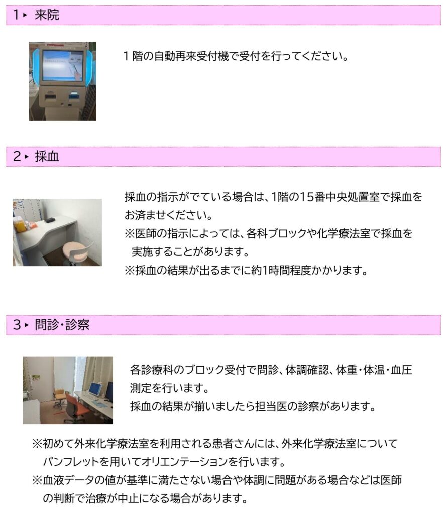 - 診察にて治療が決定したら、会計ファイルを持って外来化学療法室にいらしてください。