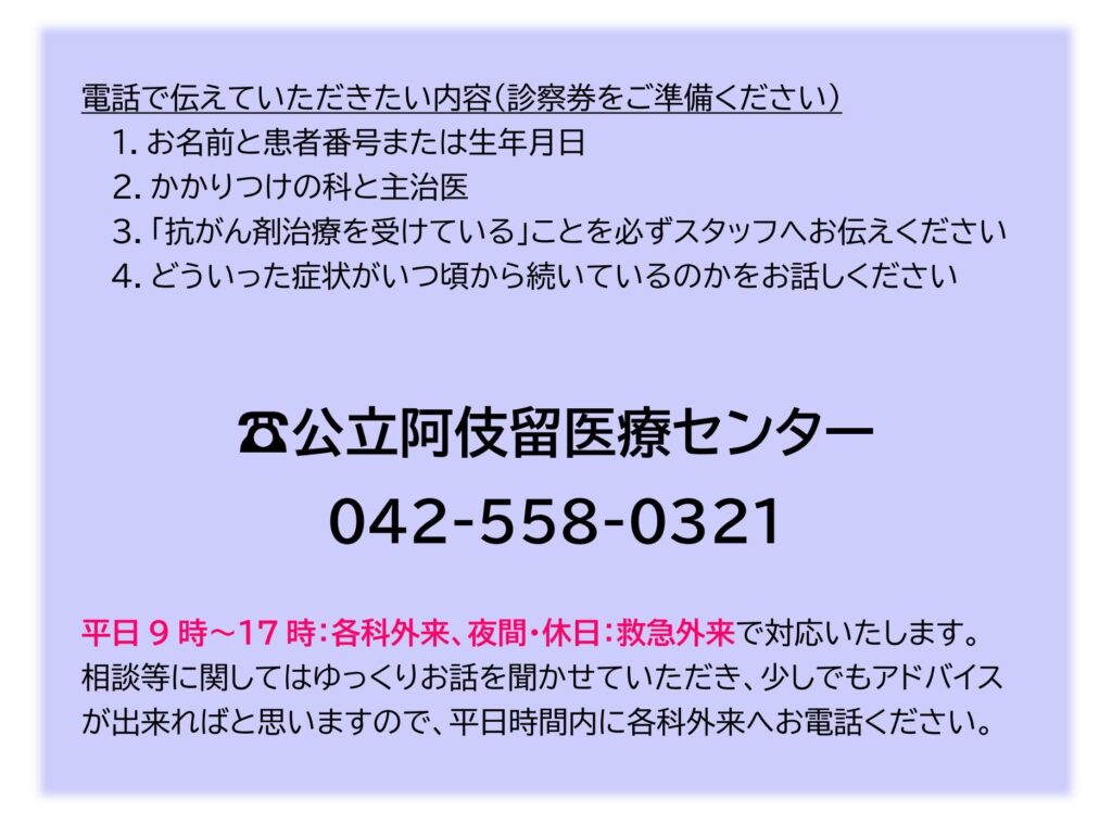 - 「抗がん剤治療を受けている」ことを必ずスタッフへお伝えください