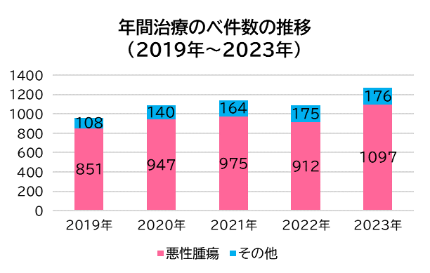 当院の外来化学療法室は、平成20年に開設され、現在8床(ベッド3床、リクライニングチェア5床)で稼働しています。外来化学療法室で実施される薬物療法は、年間約1200件を超えており、年々増加傾向にあります。