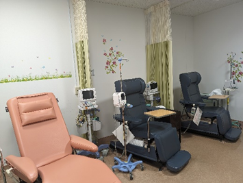 外来化学療法室は、1階中央処置室の奥にあります。 ベッド3床、リクライニングチェア5床を設置し、専任の看護師とがん化学療法看護認定看護師が担当します。 各種パンフレット(副作用、ウィッグ、がん患者サポート外来、高額療養費制度など)を用意してあります。ご自由にお持ち帰りください。