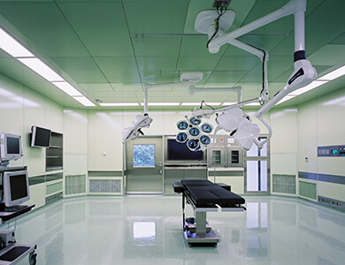 手術室は、2階部分に5室配置しました。うち1室は通常の手術室よりも更に高性能のヘパフィルターを天井に採用して空気中の塵埃や細菌を除去し、手術室内の空気を正常に保つことができるクラス100のバイオクリーンルームとなっています。
