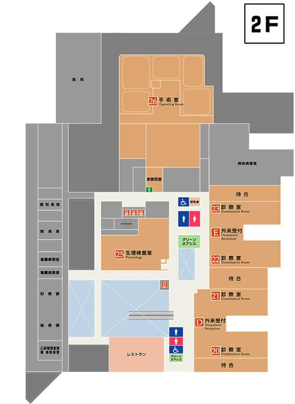 外来部門は5つのブロックに別れて1階と2階により構成され、患者さんの受診が各ブロック受付から待合ゾーン、診察ゾーンへとスムーズに移行することができます。